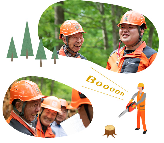 揃いのオレンジ色のユニフォームを着て、秋田のあちこちの森の中でチェーンソーや重機の音を響かせています。
